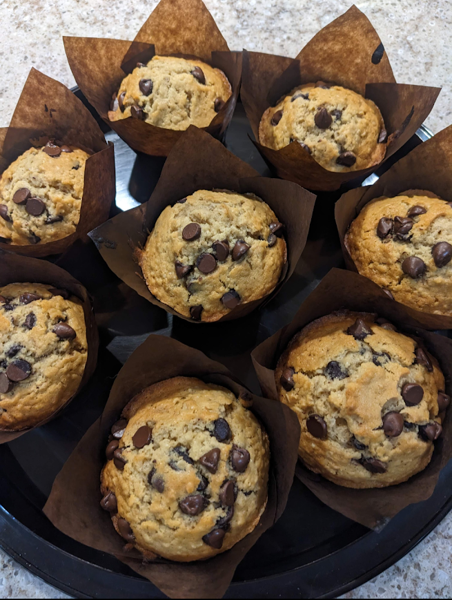 Line a 12-count muffin pan with liners or spray with cooking spray. Divide batter evenly among each cup or liner. Add additional chocolate chips to the top of the muffins before baking if desired. Note: These are large muffins, meaning the batter should fill right to the top of each liner.
